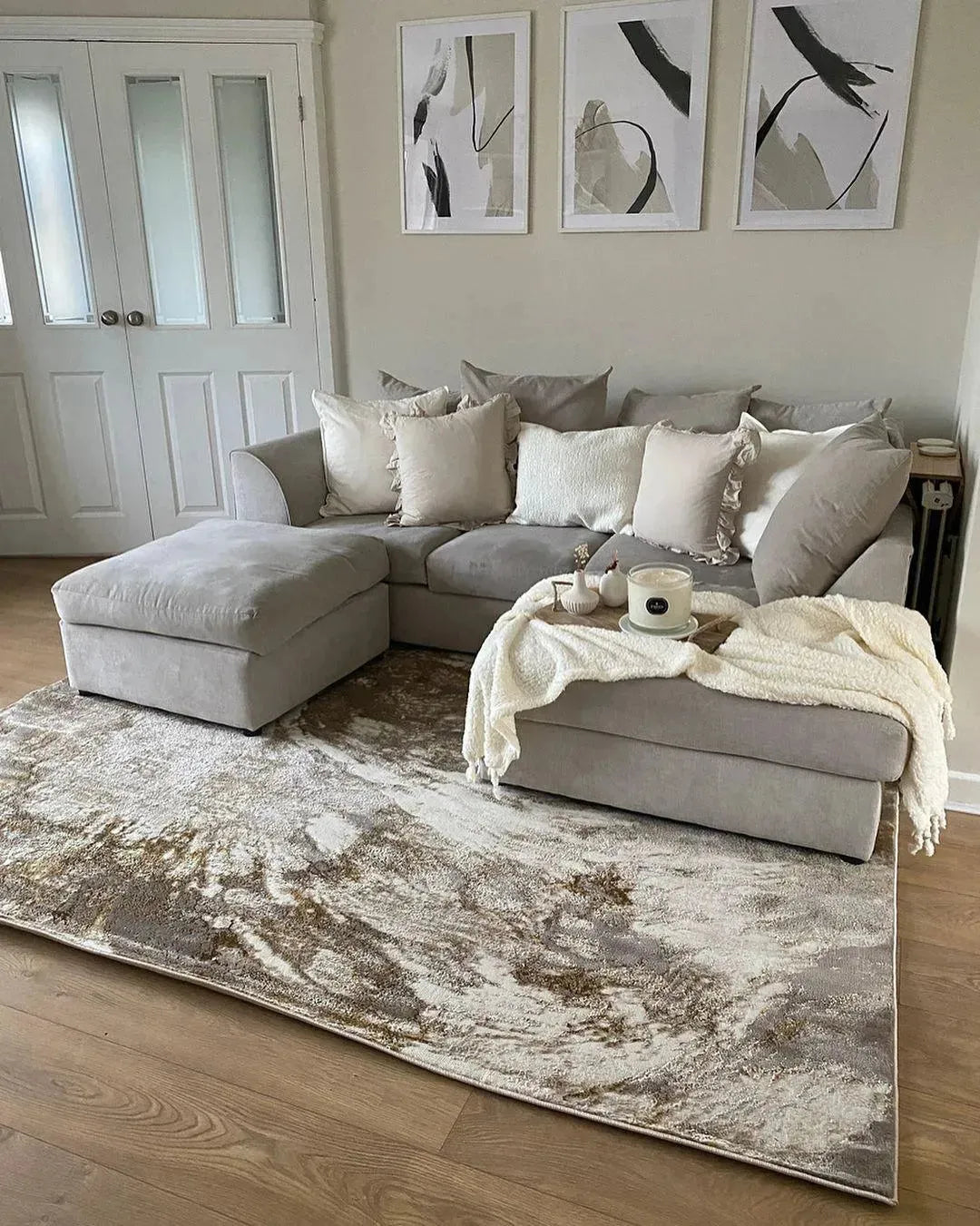 A rug with a swirling design of natural browns and gold, the Helen rug is sure to be the centre of any room. The sophisticated neutral tones blend in well with any decor and make it an easy addition to your home.